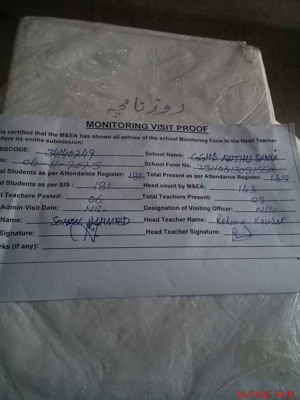 | Attendance Register | Head Teacher | MEA with School | Visit Proof |
