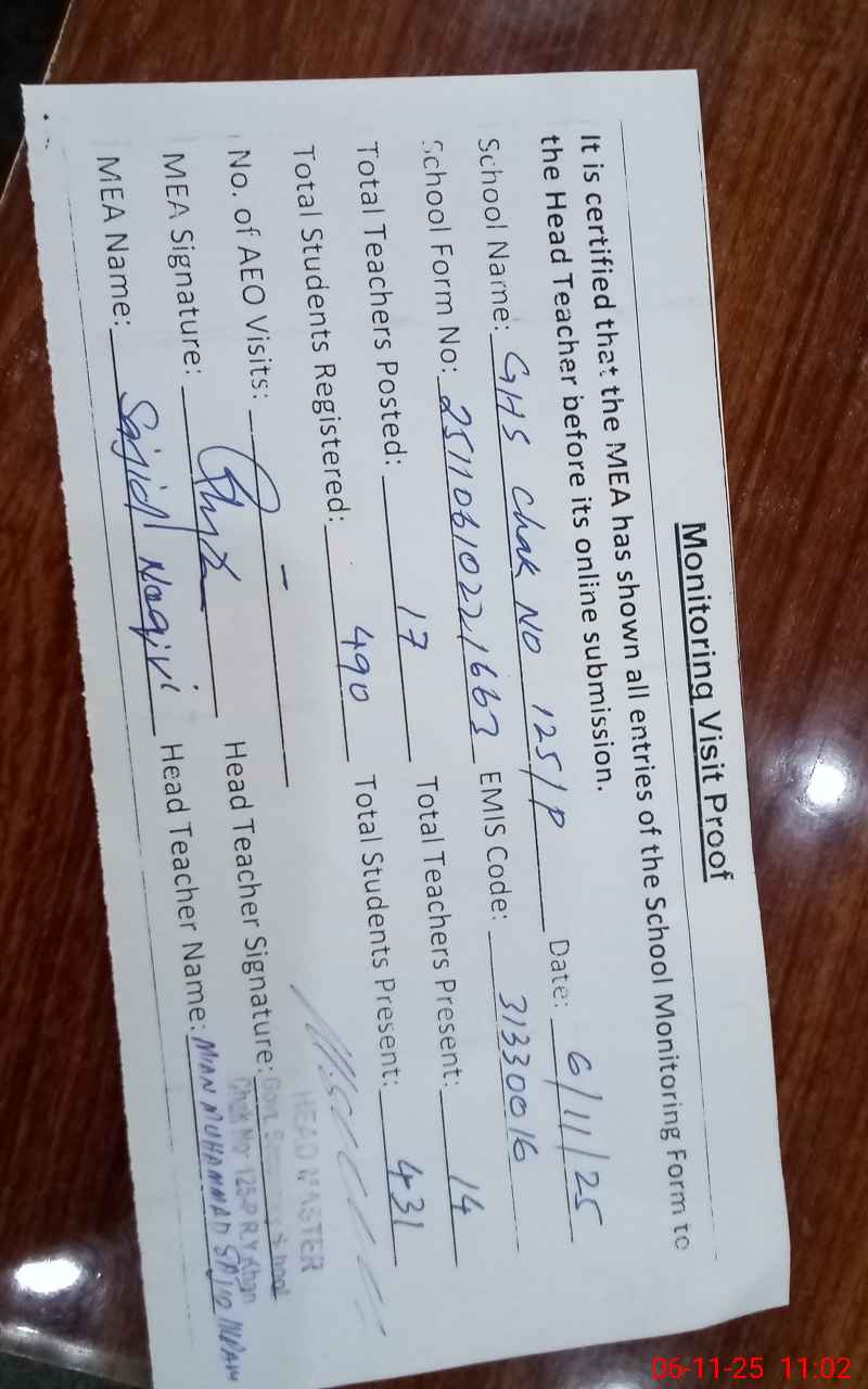 | EMIS Code: 31330016 | Name of School: GHS CHAK NO 125 P | |||