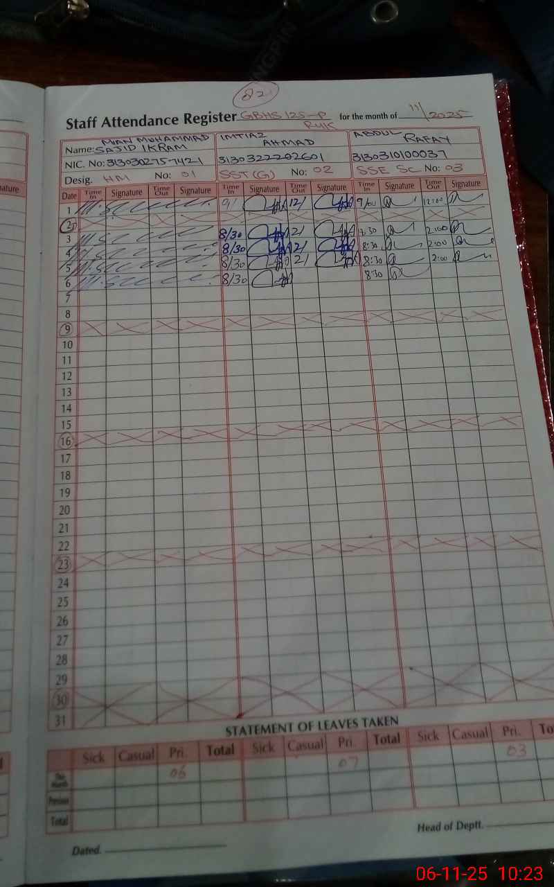 | CNIC | Full Name | Designation | R/C | Absence During Last Calender Month |