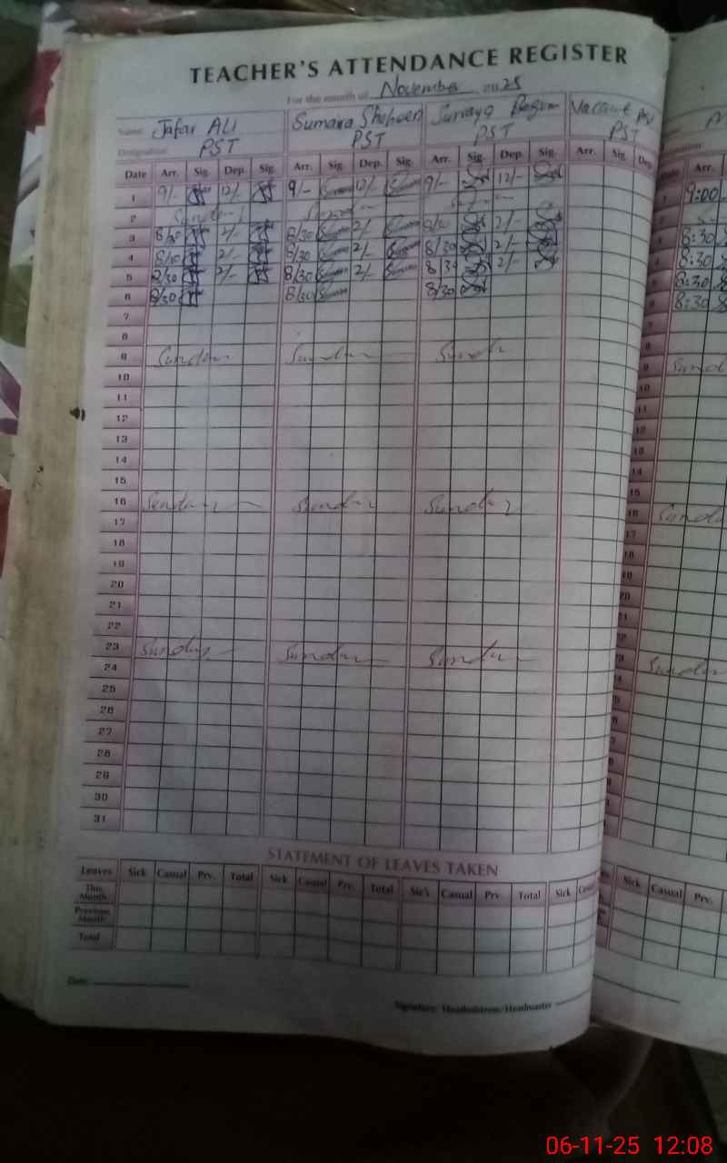 | Total no. of Classrooms: 8 No. of Classrooms Used for Teaching: 3 No. of Classrooms Storing Old Furniture, FTBs, etc: 0Comments if Any: Cash book for NSB record not maintained after July 2025 |