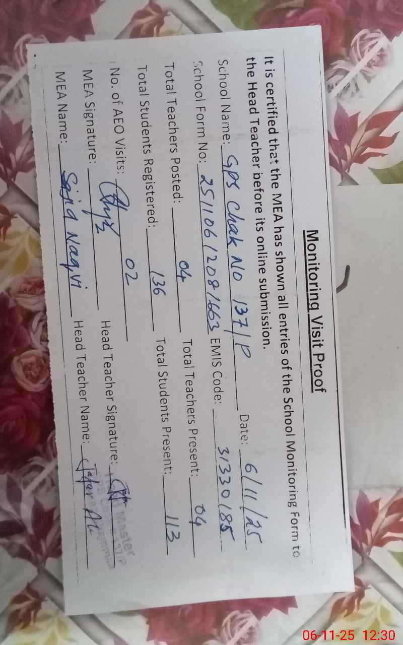 | EMIS Code: 31330185 | Name of School: GPS CHAK NO. 137/P | |||