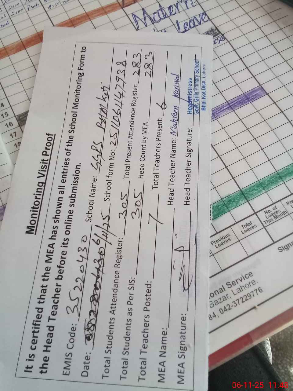 | Attendance Register | Head Teacher | MEA with School | Visit Proof |