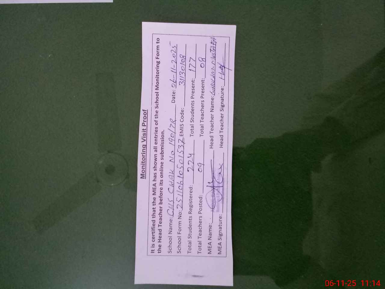 | Attendance Register | Head Teacher | MEA with School | Visit Proof |