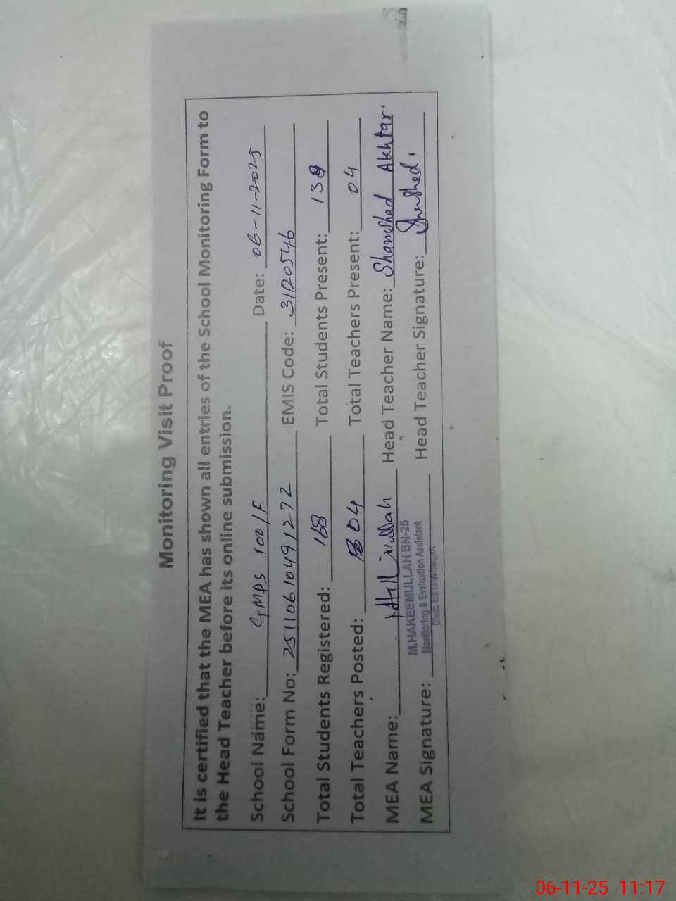 | EMIS Code: 31120546 | Name of School: GMPS CHAK NO 100/F | |||