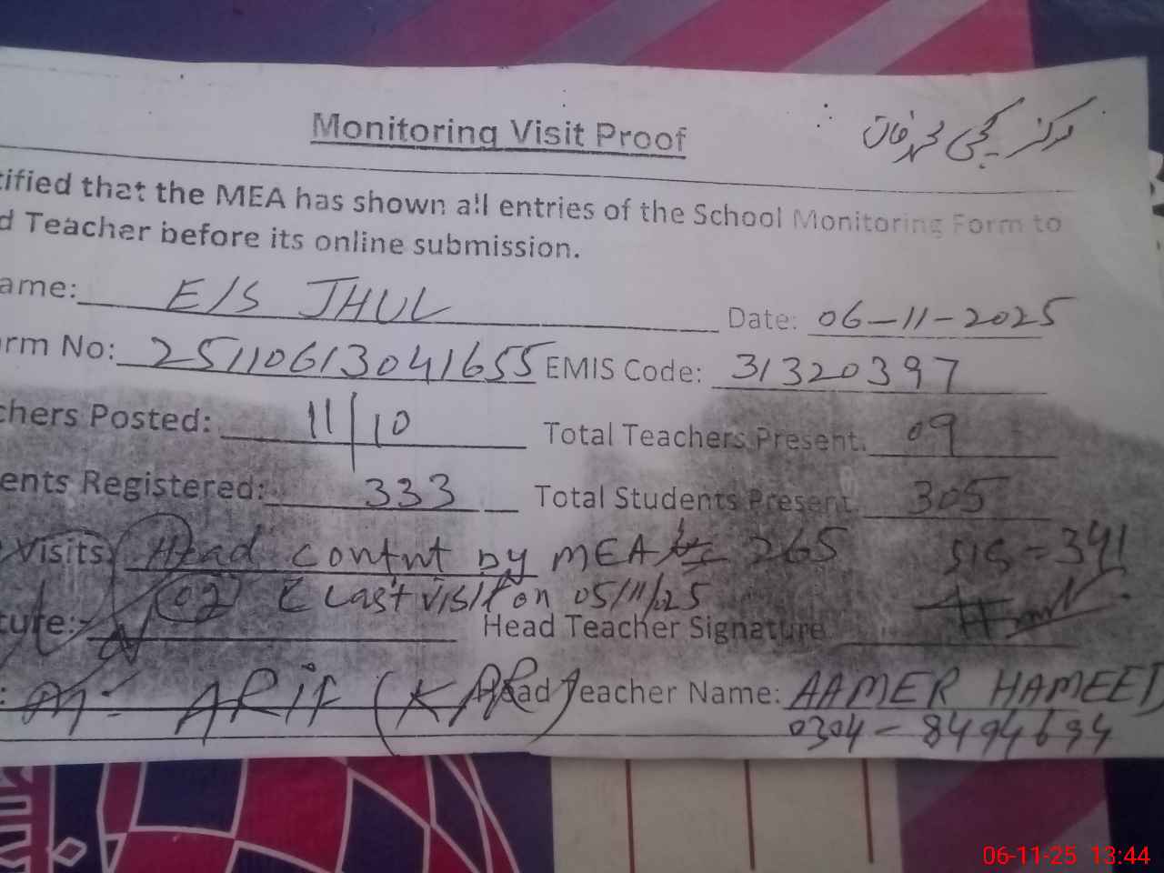 | Name: AA**** HA**** Designation: (School Headmaster's/Headmistress's) SST Phone/Cell Number: 03**** |