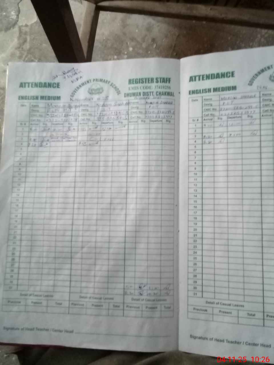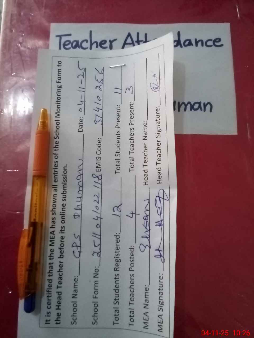 | Attendance Register | Head Teacher | MEA with School | Visit Proof |