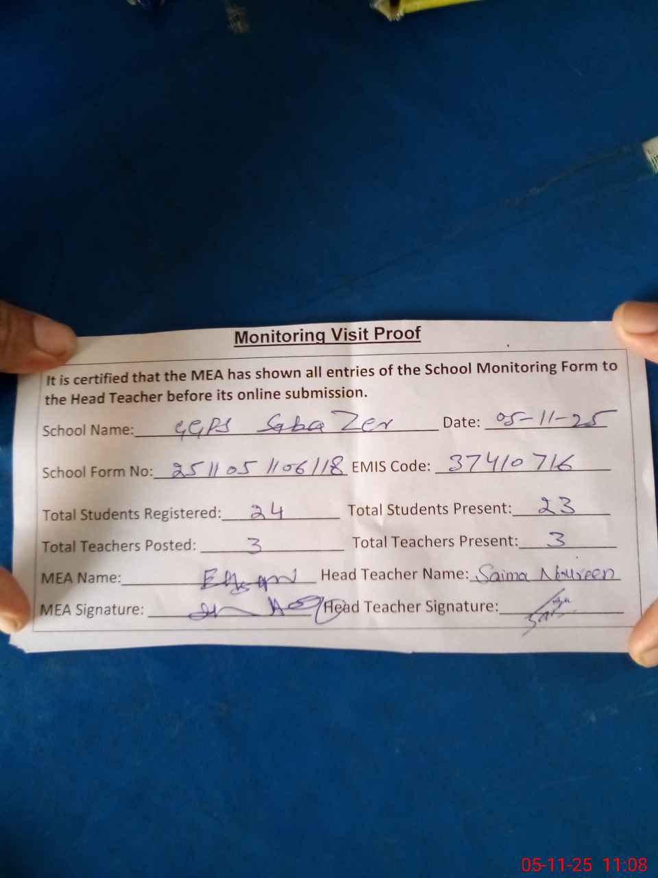 | Attendance Register | Head Teacher | MEA with School | Visit Proof |
