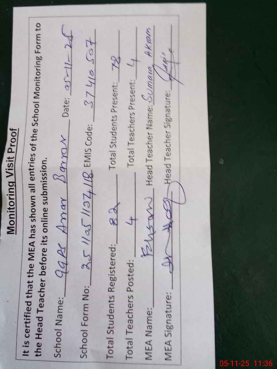 | Attendance Register | Head Teacher | MEA with School | Visit Proof |