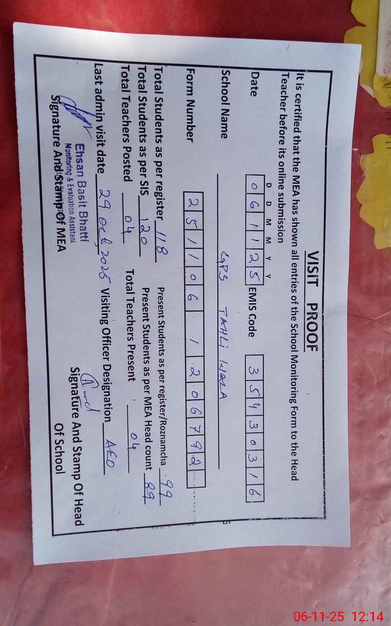 | EMIS Code: 35430316 | Name of School: GPS TAHLI WALA | |||