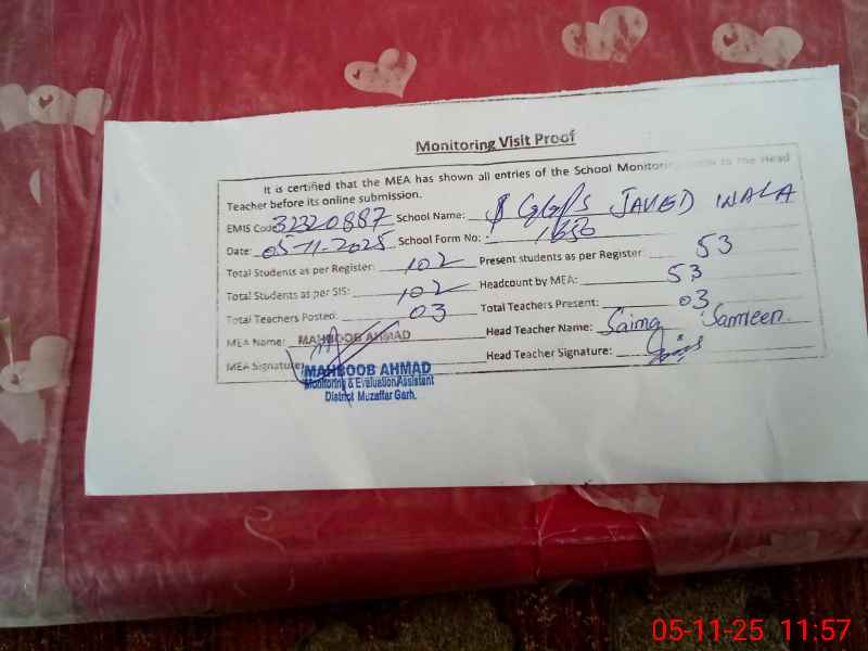 | EMIS Code: 32320887 | Name of School: GGPS JAVED WALA | |||