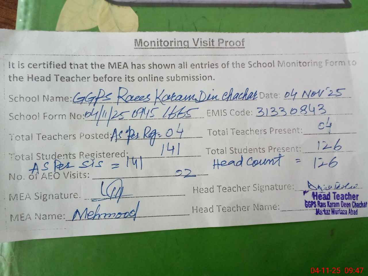 | Attendance Register | Head Teacher | MEA with School | Visit Proof |