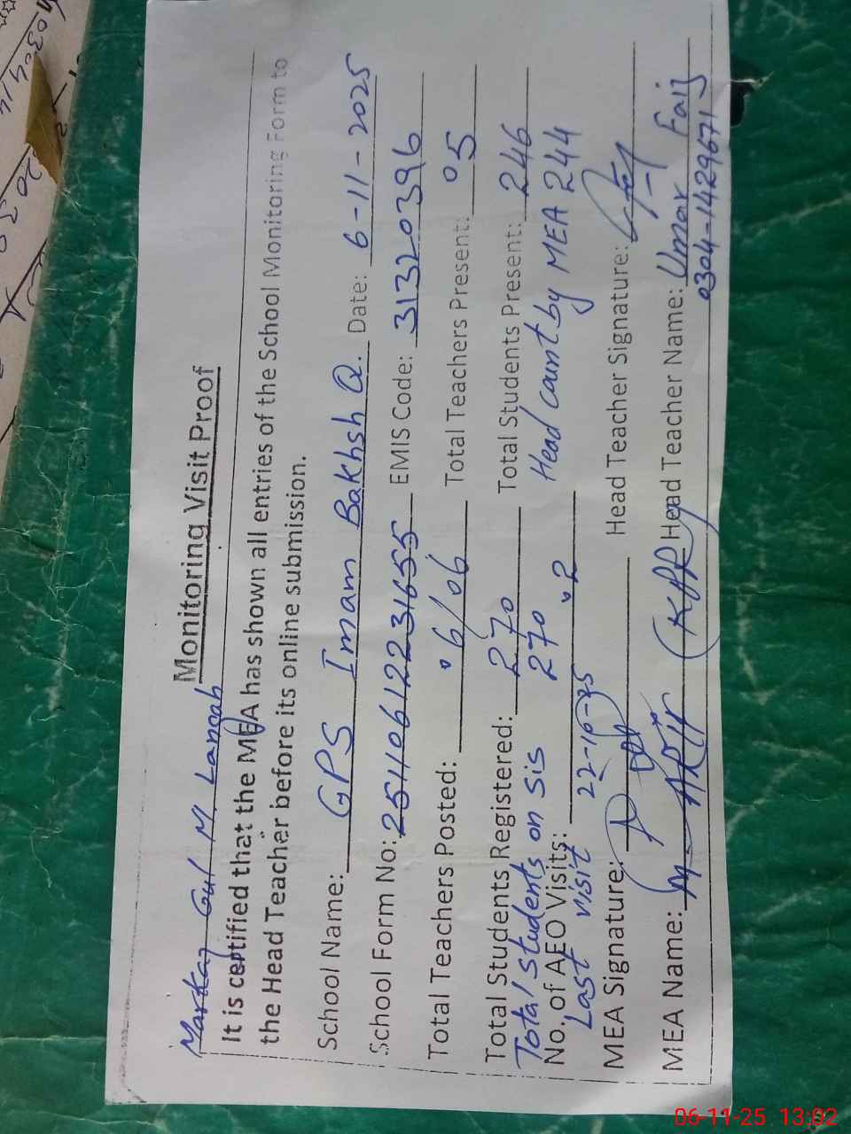 | Attendance Register | Head Teacher | MEA with School | Visit Proof |