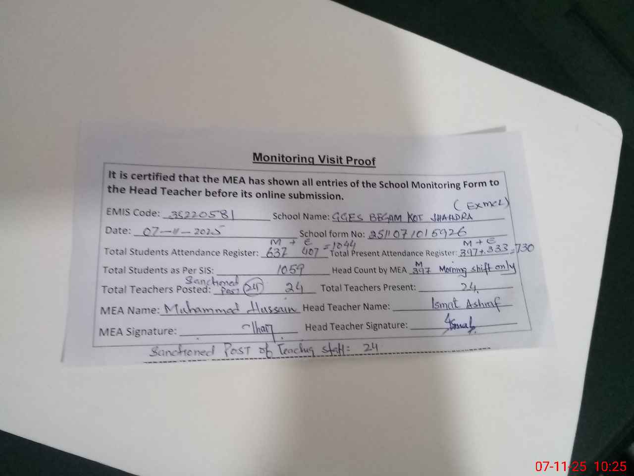 | Remarks (Use Separate Page if Required): 1 AEO visited school last month dated 2nd October 2025 and 8th October 2025 2 Double shift school and head counted morning shift only | |||||