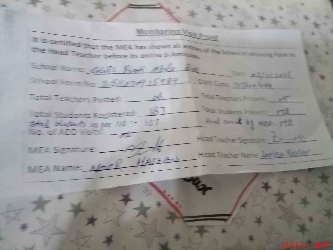 | Attendance Register | Head Teacher | MEA with School | Visit Proof |