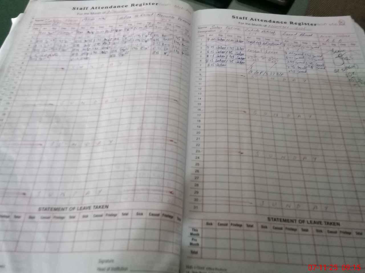 | CNIC | Full Name | Designation | R/C | Absence During Last Calender Month |