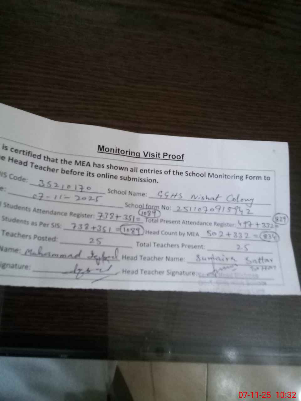| Monitoring Date: 07-11-2025 | Start Time: 07-11-2025 09:15 AM | End Time: 07-11-2025 10:35 AM | Name of MEA: Mu**** Iq**** | |