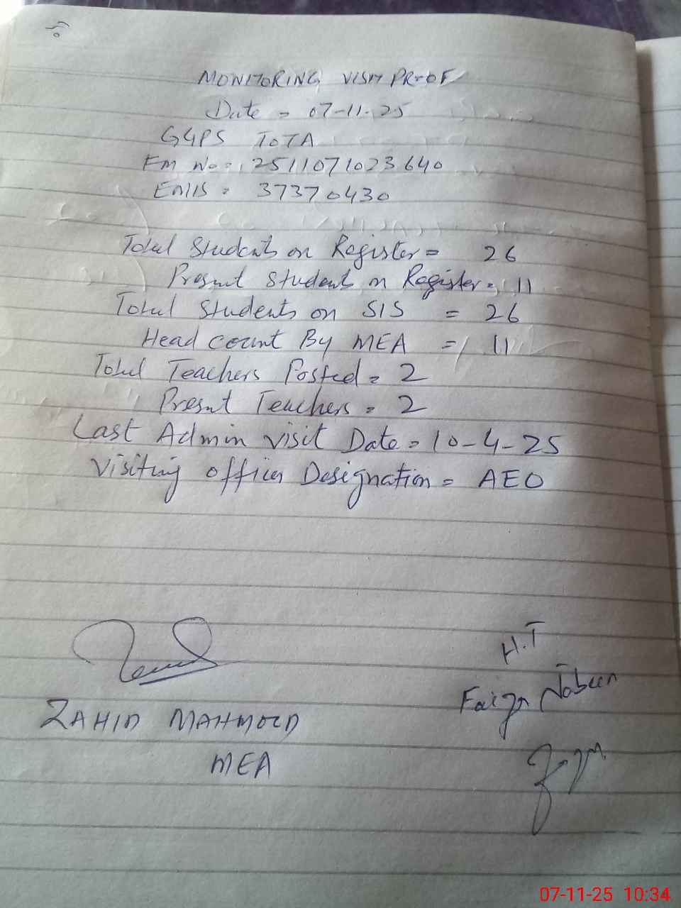 | Attendance Register | Head Teacher | MEA with School | Visit Proof |
