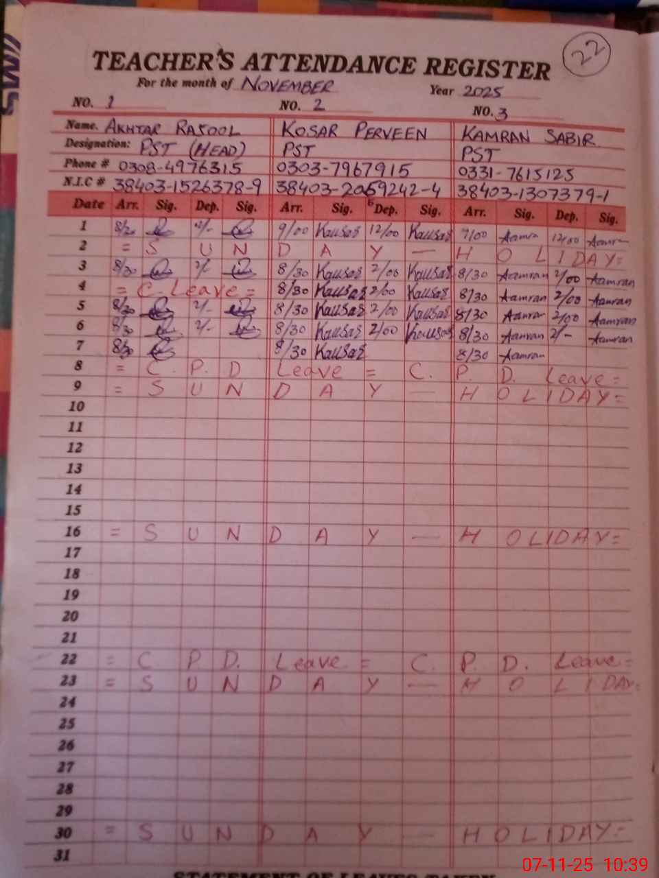 | CNIC | Full Name | Designation | R/C | Absence during last cal. month |