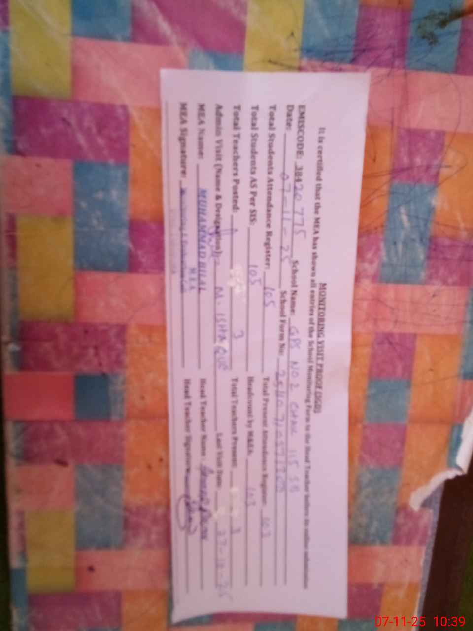 | Certified that this School was Inspected by the Undersigned MEA/DMO Today and the Information Stated Above is as Per Record. | |||||