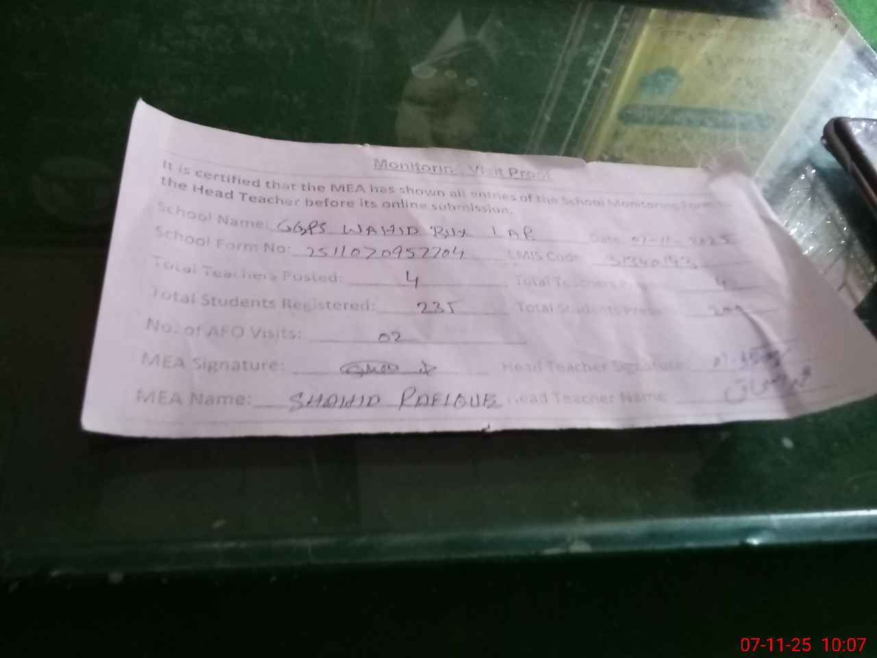 | Monitoring Date: 07-11-2025 | Start Time: 07-11-2025 09:42 AM | End Time: 07-11-2025 10:10 AM | Name of MEA: Sh**** Ra**** | |