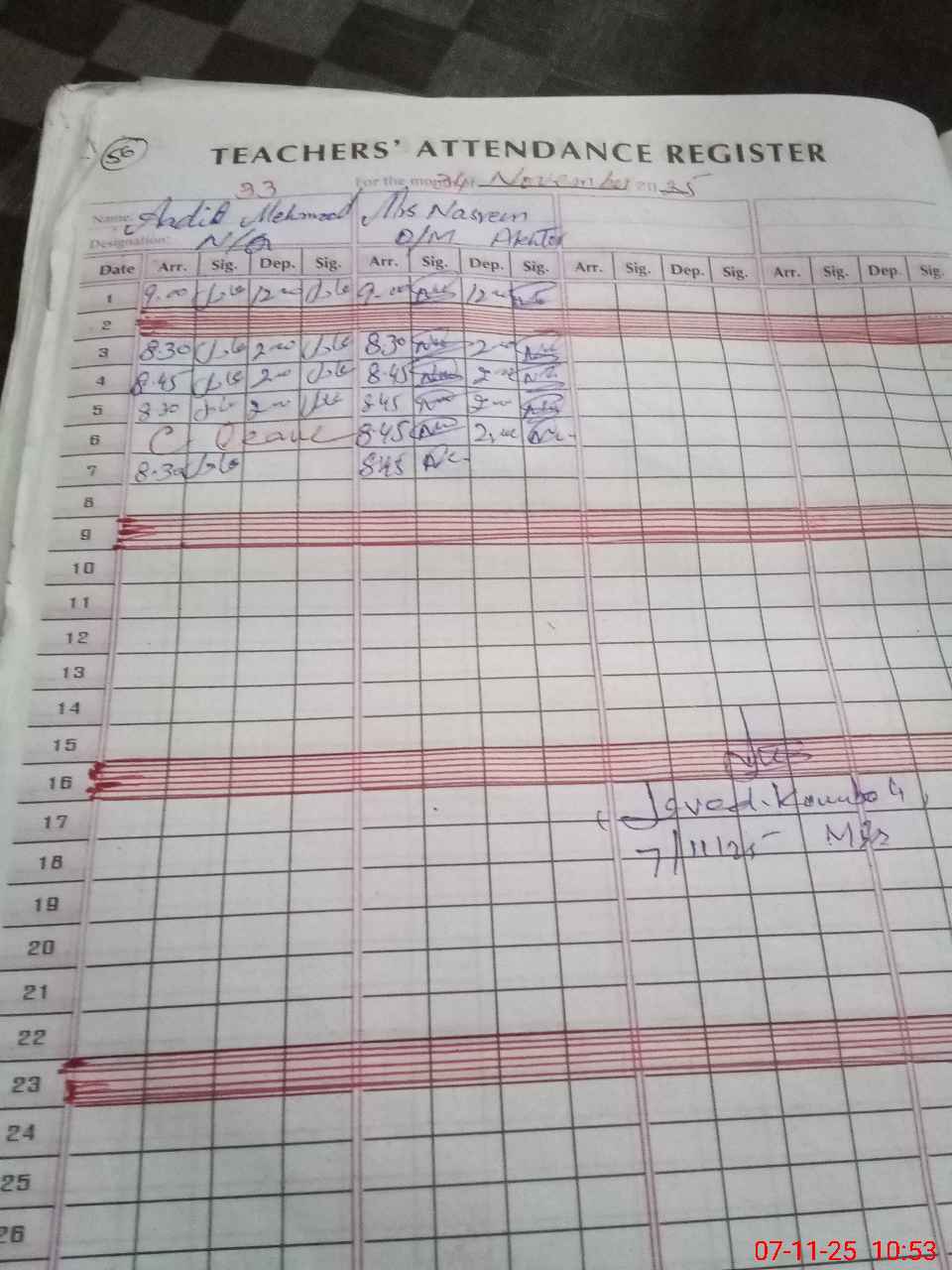 | Monitoring Date: 07-11-2025 | Start Time: 07-11-2025 10:03 AM | End Time: 07-11-2025 10:54 AM | Name of MEA: Ja**** Iq**** | |