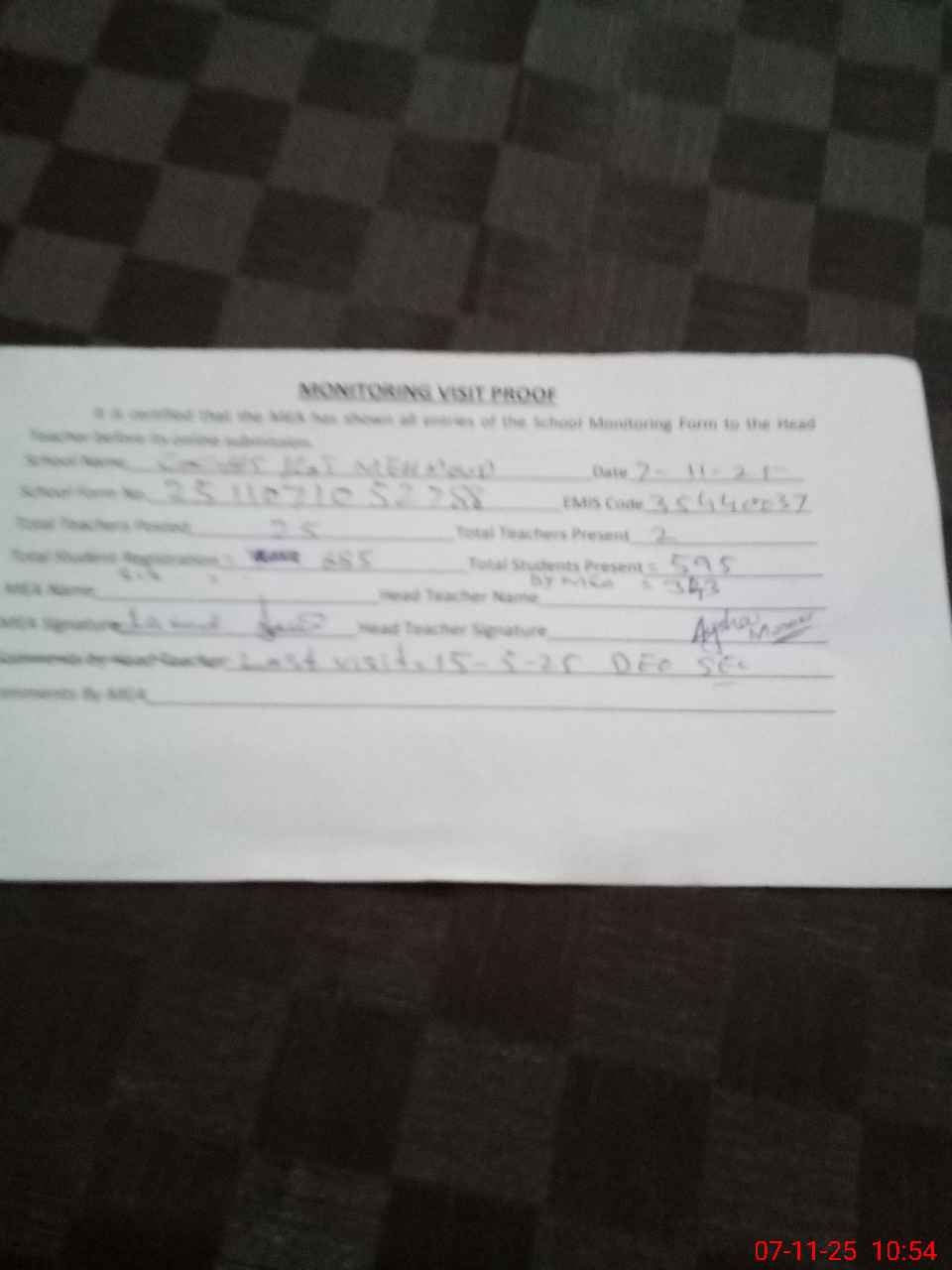 | Attendance Register | Head Teacher | MEA with School | Visit Proof |