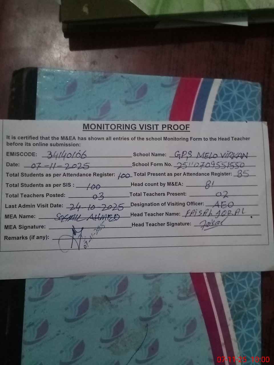 | EMIS Code: 34140106 | Name of School: GPS MELO VIRKAN | |||