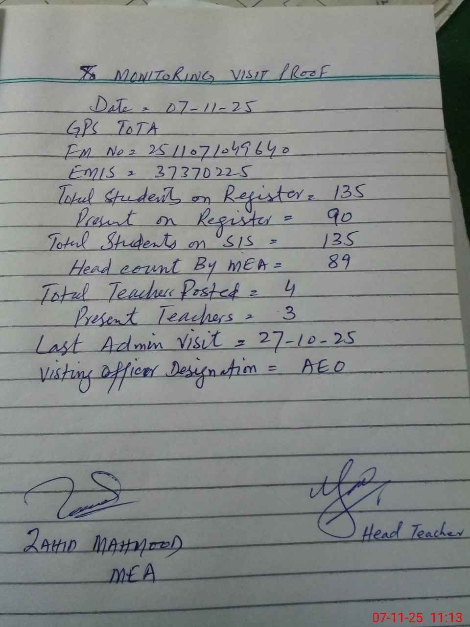 | Attendance Register | Head Teacher | MEA with School | Visit Proof |