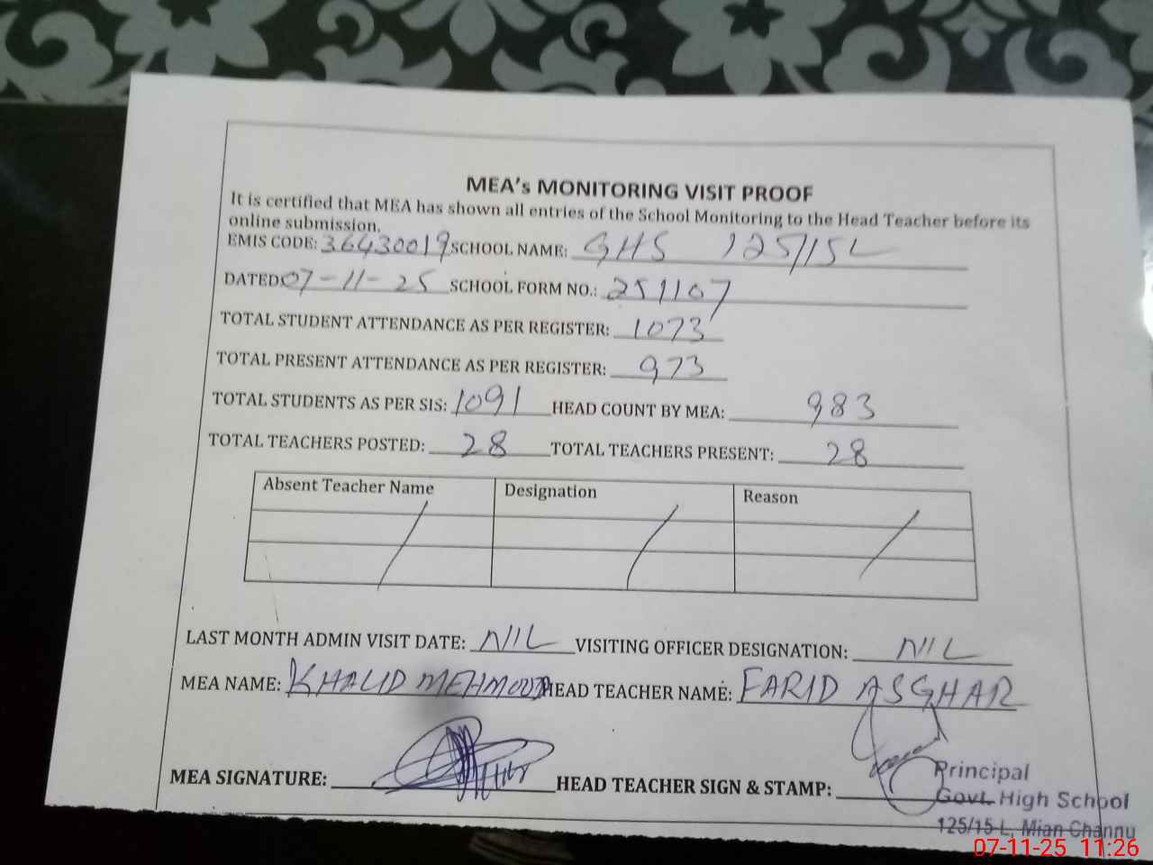 | Attendance Register | Head Teacher | MEA with School | Visit Proof |