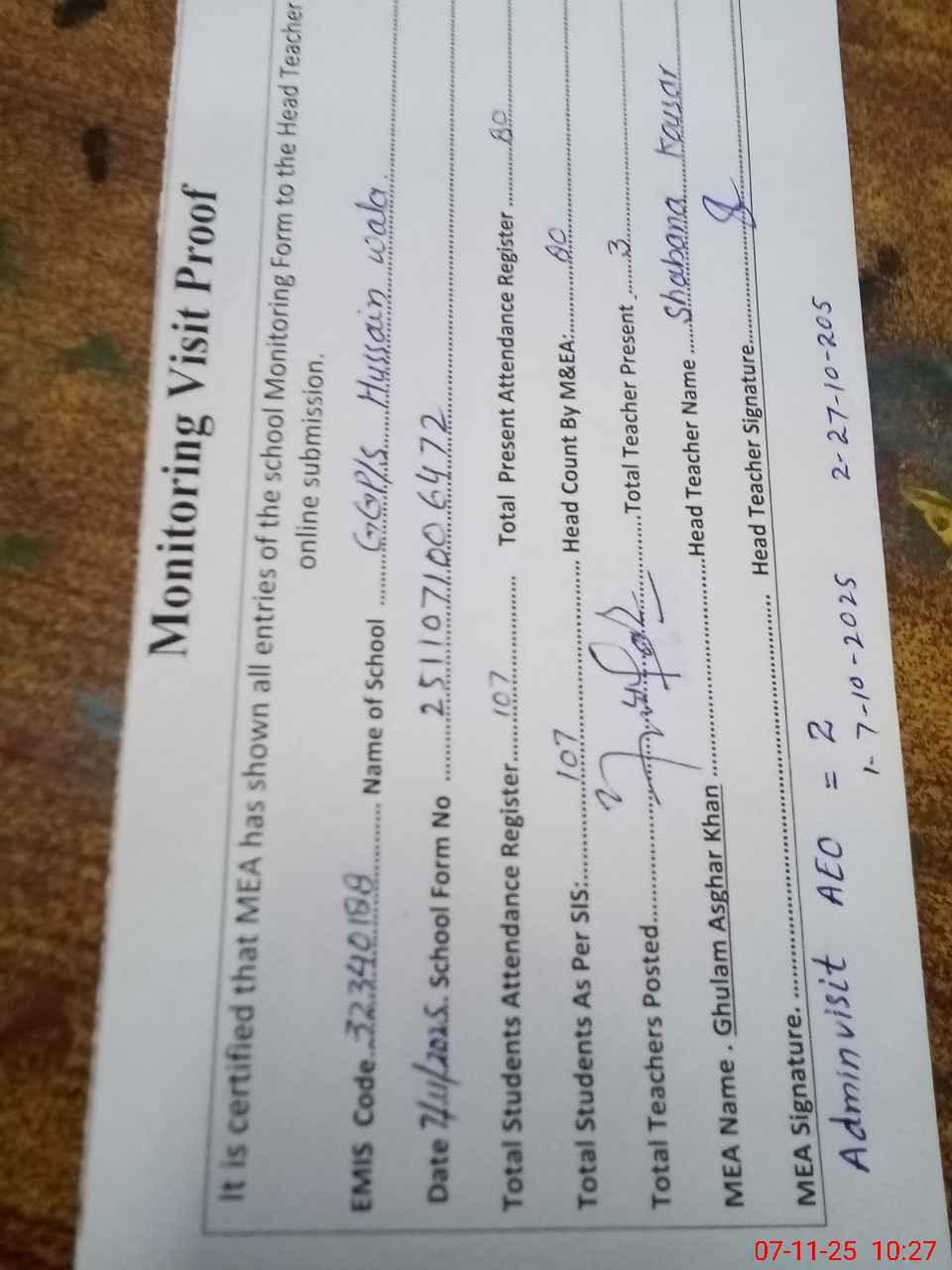 | EMIS Code: 32340188 | Name of School: GGPS HUSSAIN WALA | |||