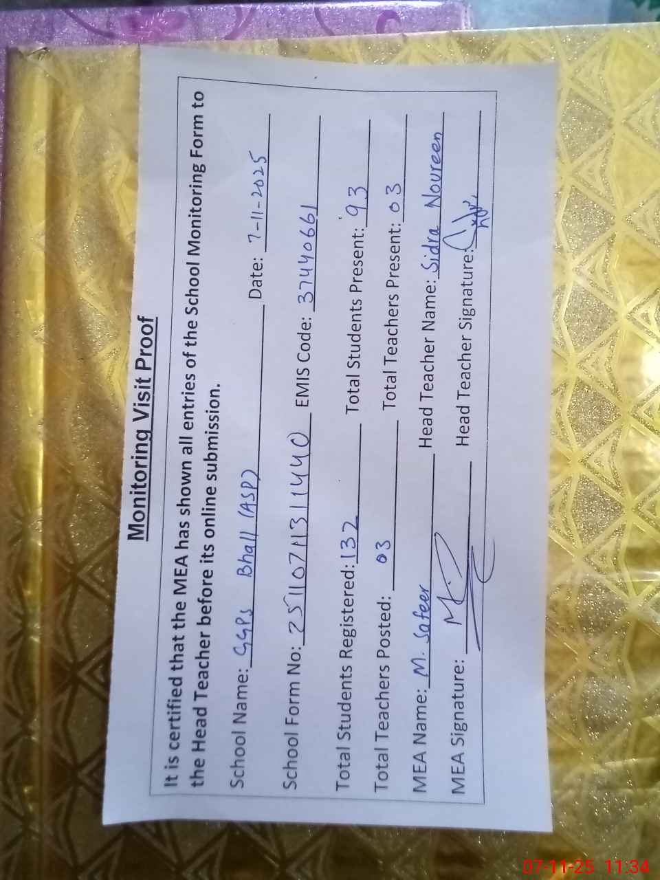 | Attendance Register | Head Teacher | MEA with School | Visit Proof |