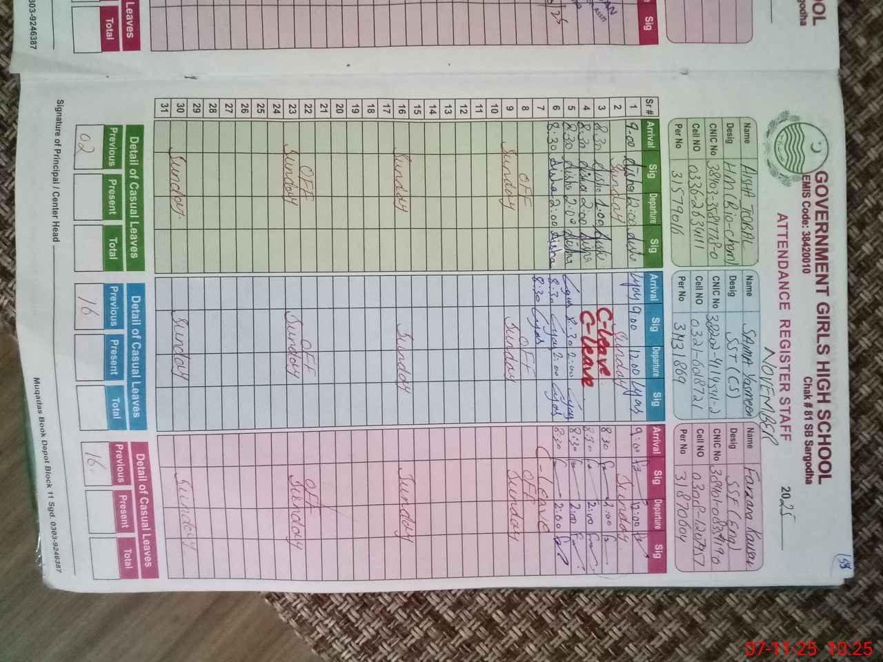| CNIC | Full Name | Designation | R/C | Absence during last cal. month |