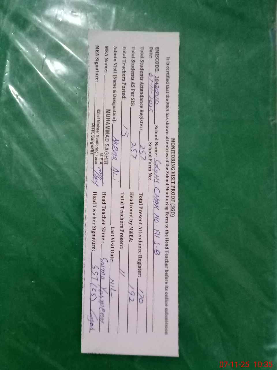 | Attendance Register | Head Teacher | MEA with School | Visit Proof |