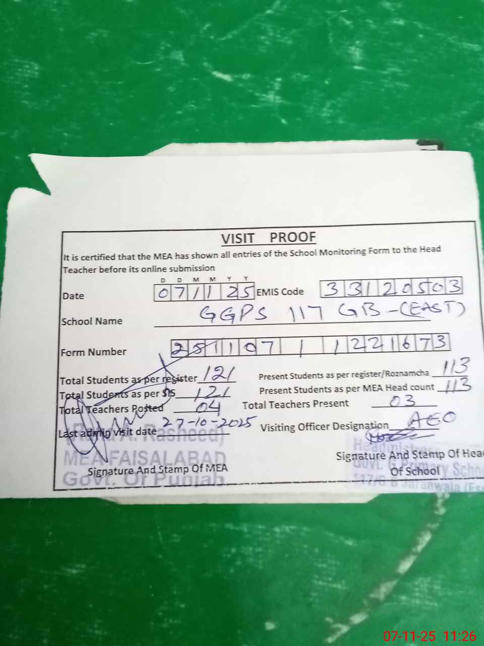 | Attendance Register | Head Teacher | MEA with School | Visit Proof |
