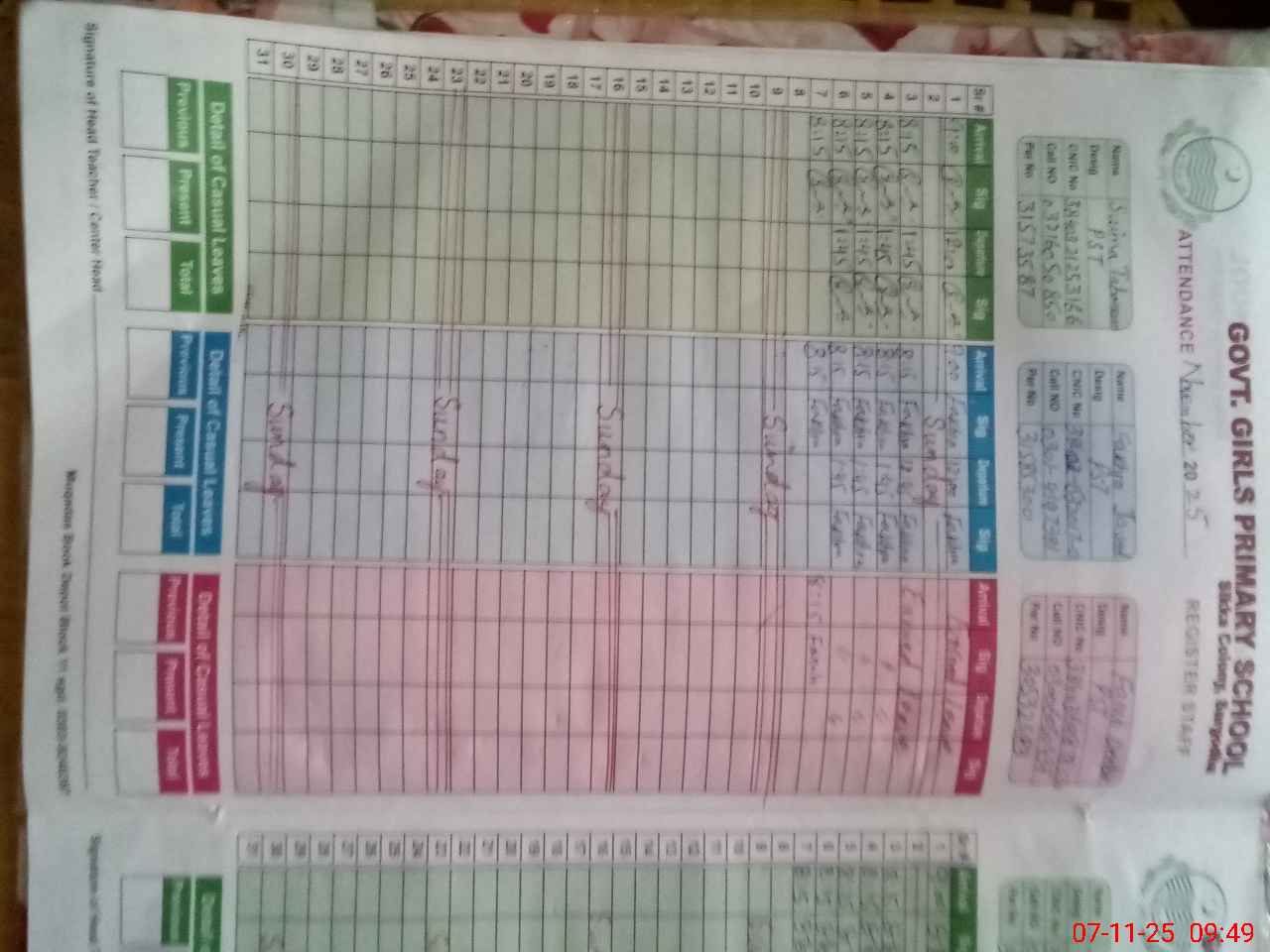 | CNIC | Full Name | Designation | R/C | Absence During Last Calender Month |