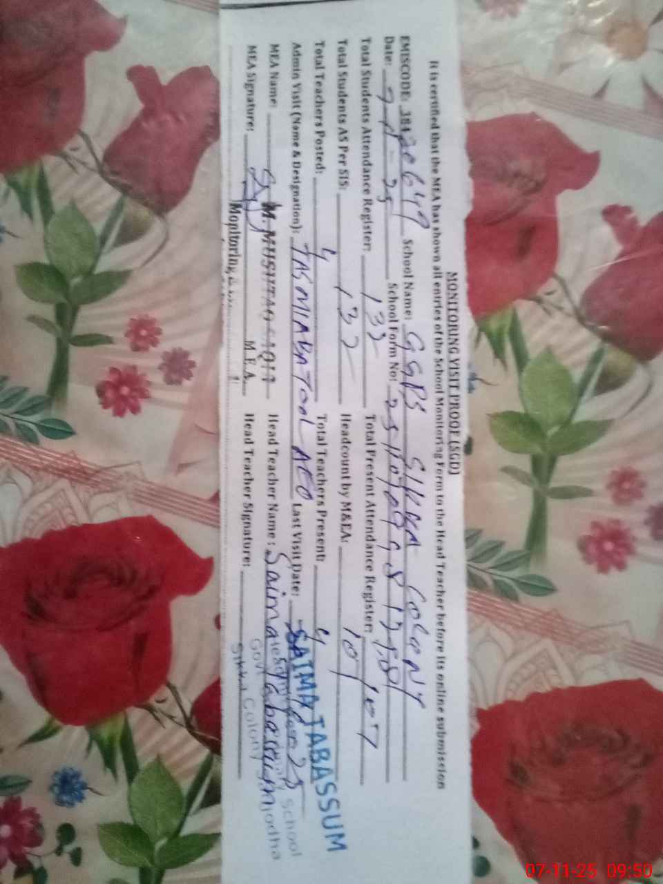 | Attendance Register | Head Teacher | MEA with School | Visit Proof |