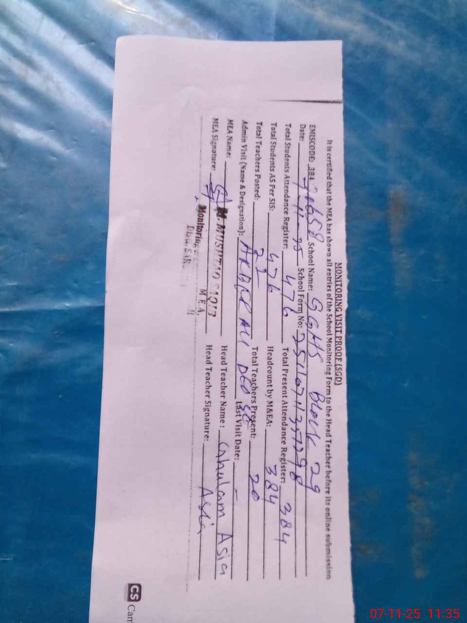 | Attendance Register | Head Teacher | MEA with School | Visit Proof |