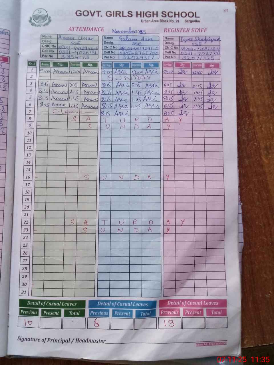 | CNIC | Full Name | Designation | R/C | Absence During Last Calender Month |