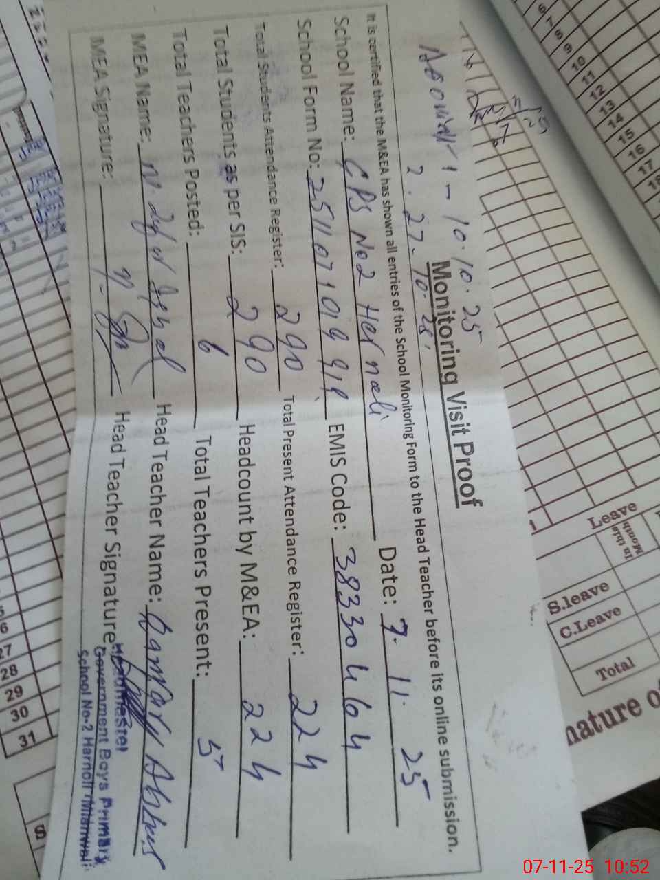 | Attendance Register | Head Teacher | MEA with School | Visit Proof |