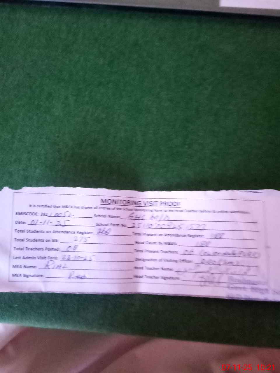 | Attendance Register | Head Teacher | MEA with School | Visit Proof |
