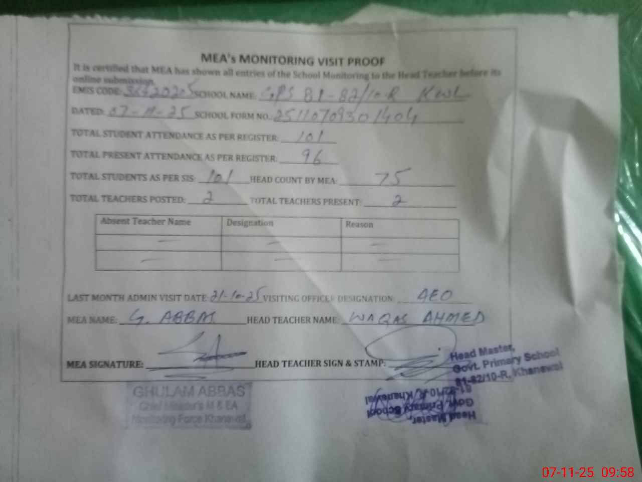 | EMIS Code: 36420205 | Name of School: GPS 81-82/10-R, KHANEWAL | |||