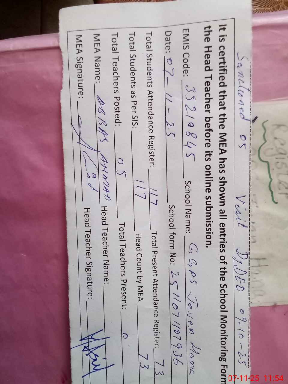 | Certified that this School was Inspected by the Undersigned MEA/DMO Today and the Information Stated Above is as Per Record. | |||||