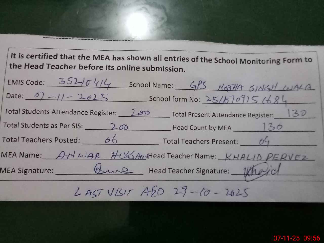 | Remarks (Use Separate Page if Required): Class Room and Wash Room required white wash Last visit AEO 29 October 2025 Junaid Iqbal Chokidar attached this School from GES Muftpura wef 20 January 2023 to till date 35210414 | |||||
