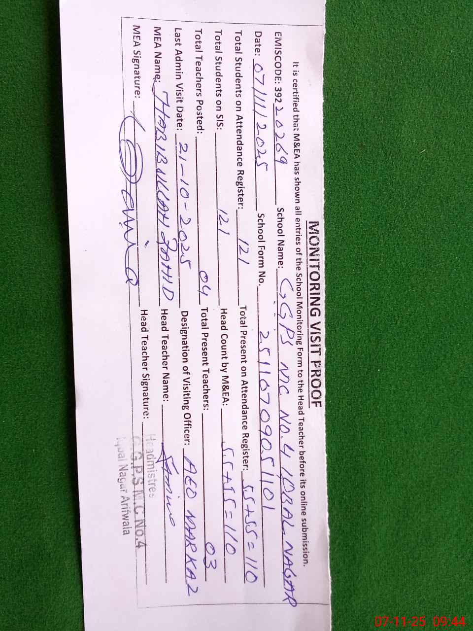 | Monitoring Date: 07-11-2025 | Start Time: 07-11-2025 08:52 AM | End Time: 07-11-2025 09:45 AM | Name of MEA: Ha**** Ul**** Ur**** Ba**** Al**** | |