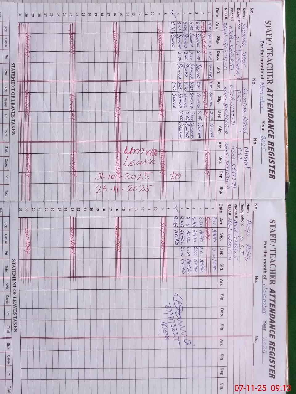 | CNIC | Full Name | Designation | R/C | Absence During Last Calender Month |