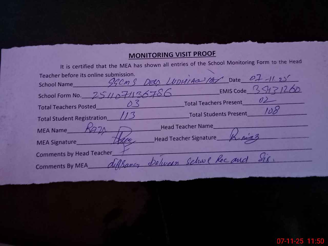 | Attendance Register | Head Teacher | MEA with School | Visit Proof |