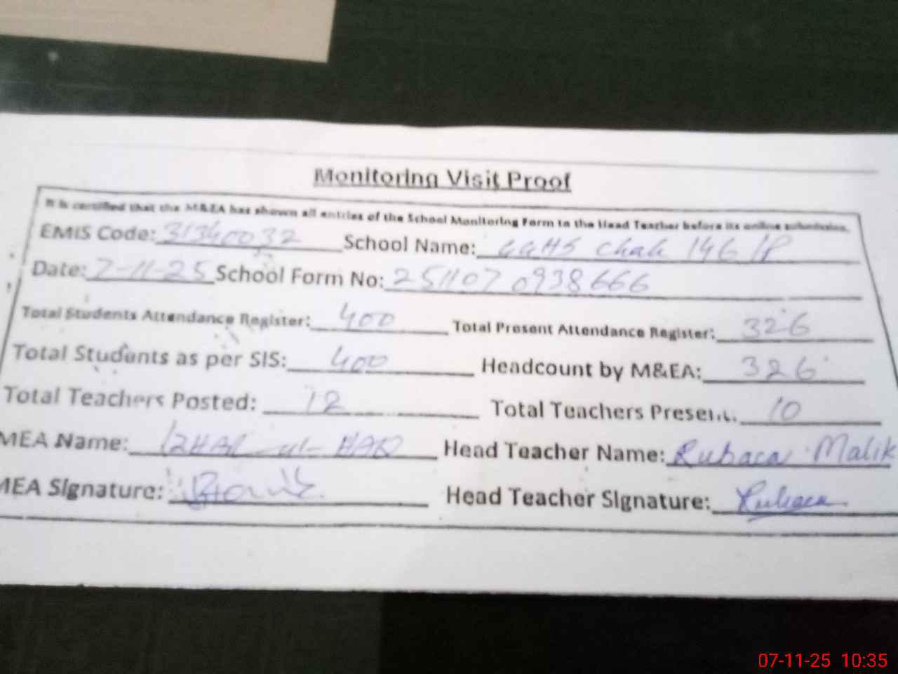 | Attendance Register | Head Teacher | MEA with School | Visit Proof |