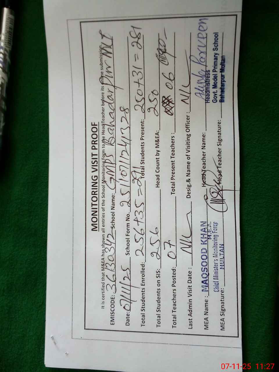 | EMIS Code: 36130342 | Name of School: GMPS BAHADAR PUR NEAR BASTI NAU | |||