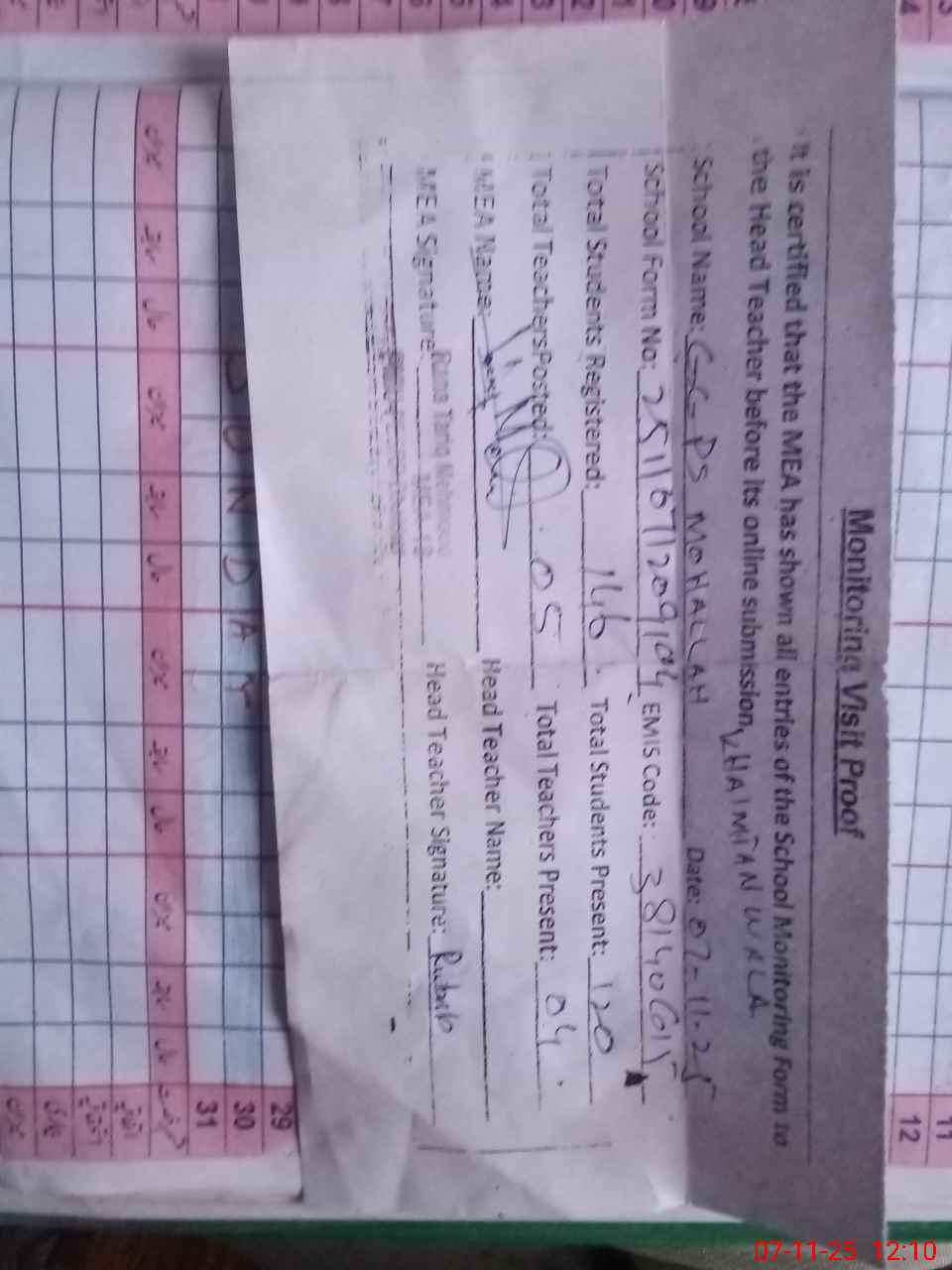 | Remarks (Use Separate Page if Required): Last visit of education authority 1 Designation AEO 2 Name ANAM BASHIR 3 Date of visit 22 Oct 2025 | |||||