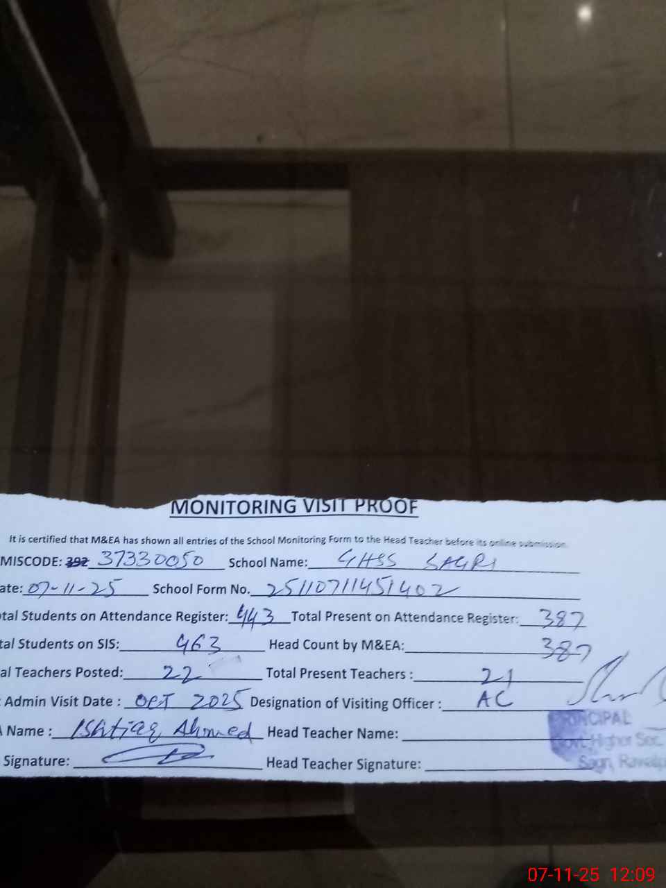 | Monitoring Date: 07-11-2025 | Start Time: 07-11-2025 11:36 AM | End Time: 07-11-2025 12:13 PM | Name of MEA: Is**** Ah**** | |